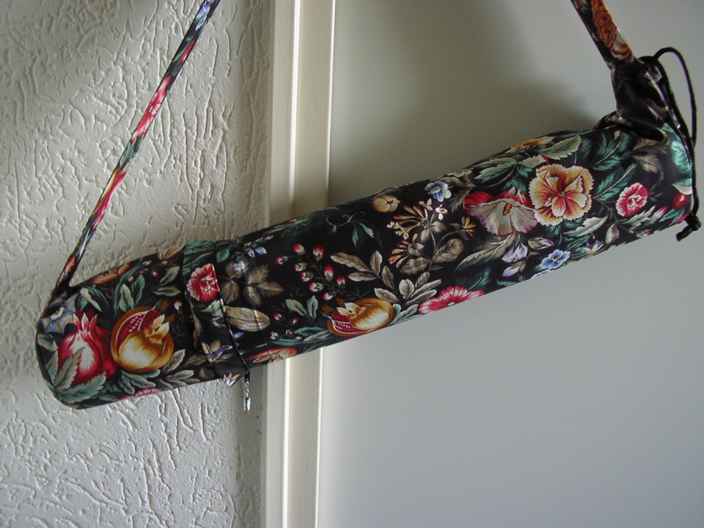 Voor je begint neem je de maat van je mat. Rol de mat op, meet de breedte, de omtrek en reken 7.5 cm meer voor de naden en zomen. Plus nog extra stof voor de draagriem en de bodem van de tas.